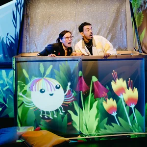 »Allez hop« bietet Musiktheater, bei dem alle Register der Fantasie gezogen werden: In einem unbekannten Land, vor gar nicht allzu langer Zeit, da lebten auf der klangfarbenfrohen Blumenwiese die kleinen, frechen, schlauen Blumen Poppy (Sarah Jeanne Babits) und Dandelion (Simon Schober). Mit ihnen erleben Drei- bis Fünfjährige spannende Abenteuer und jede Menge gute Musik. Und natürlich locken sie mit Liedern von Matthias Werner auch das kugelrund-wuselige Allez hop aus seinem Haus. Die digitalen Live-Zeichnungen von OMAi und das wandelbare Bühnenbild eröffnen eine zauberhafte Traumwelt. Spielfreudige Weggefährt:innen wie Frédéric Alvarado-Dupuy von Federspiel, Maria Danneberg, Anaïs Tamisier und Katelyn Rose King bereichern die Geschichten musikalisch.