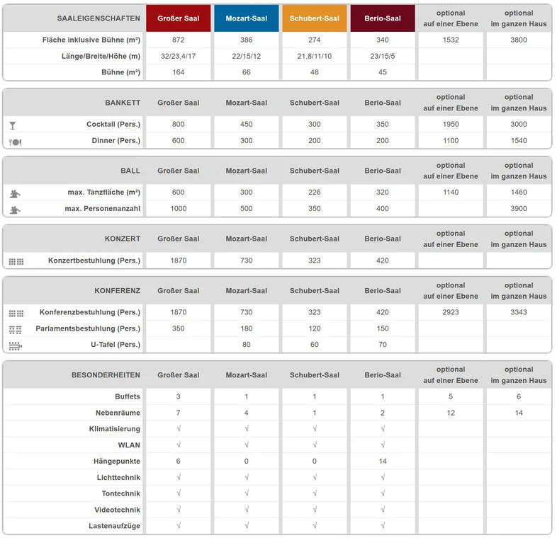Dieser exklusive Rahmen lässt sich durch die Kombination mit anderen Sälen, Foyers und Buffets beliebig erweitern. So kann etwa, unter Einbeziehung von Mozart-Saal und Schubert-Saal, ein Galadinner für bis zu 1.100 Gäste auf einer Ebene ausgerichtet werden.
